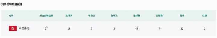 此战后,中国队将对阵中国香港队的历史战绩更新至了28场19胜7平2负,进49球失7球。